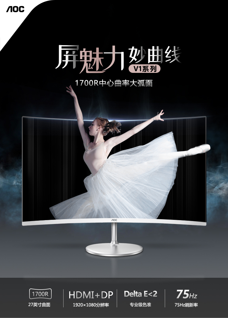AOC C27V1QD 27英寸 1700R中心曲率 FHD高清 窄边框 中国节能产品认证 曲面显示器(HDMI+DP接口)