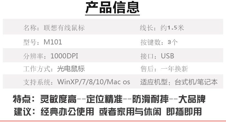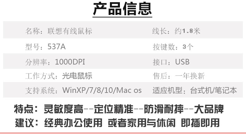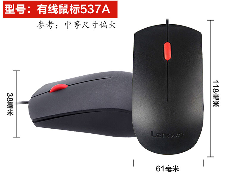 商品名称:联想(Lenovo)商务办公有线鼠标 USB接口 台式机笔记本通用电脑鼠标 经典537A线长约1.8米
