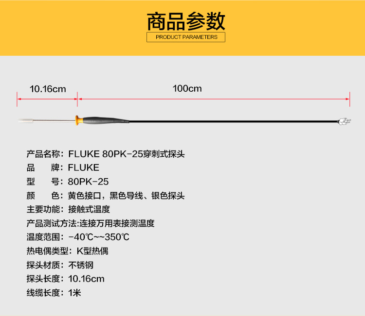 福禄克(FLUKE)80PK-25 刺穿式探针适用于食品检测可刺穿固体表面测温范围:-40℃至350℃(-40℉至662℉)